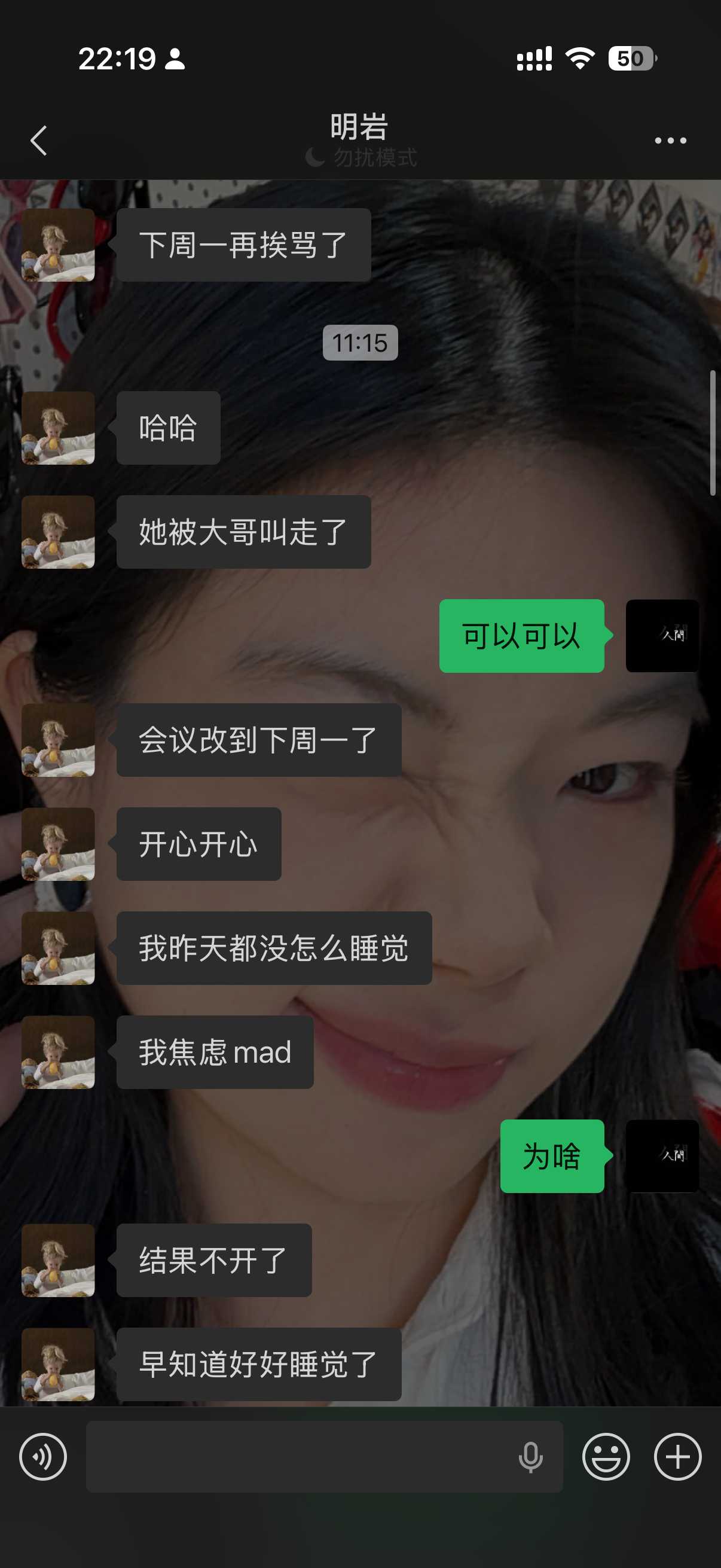 不知道明岩是不是又去喝酒了,好担心,她也不给我发消息。明知道她醒着,她不给我回应,不知道是故意的还是怎么着,真的很难过。。